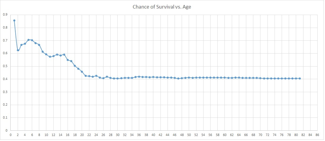 This is perhaps more aligned with assumptions of how the data should look. But doesn't this process of redefining age, force the data scientist to understand the ideological gaps at play? Making creative choices for the purposes of dissemination and palatability for an audience to extract meaning? The process of choosing the age border itself involves this task. The following figure illustrates age distribution plotted against survival rate. The age of eight was not arbitrarily chosen as it can be seen from the plot below that the first significant drop in survival rate came between the ages of 8 - 11. Another significant decrease came after the age of 14. It is clear that depending on the data scientist's definition of adulthood, the visualization and shock value of the data will change.