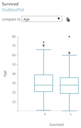 When initially posing the question of whether age has a significant impact on survival, a multibox plot produced from Microsoft Azure Machine Learning Studio, negates the assumption that age and survival rates are significantly intertwined. From looking at the first plot, it can be seen that 0 (deceased) and 1 (survived) have similar median values, represented by the horizontal line within the box. There is some variance in the min and max, as well as the interquartile range, but the outliers average this out and little significant change is apparent. This pushes up against the assumption that children were evacuated from the ship first.