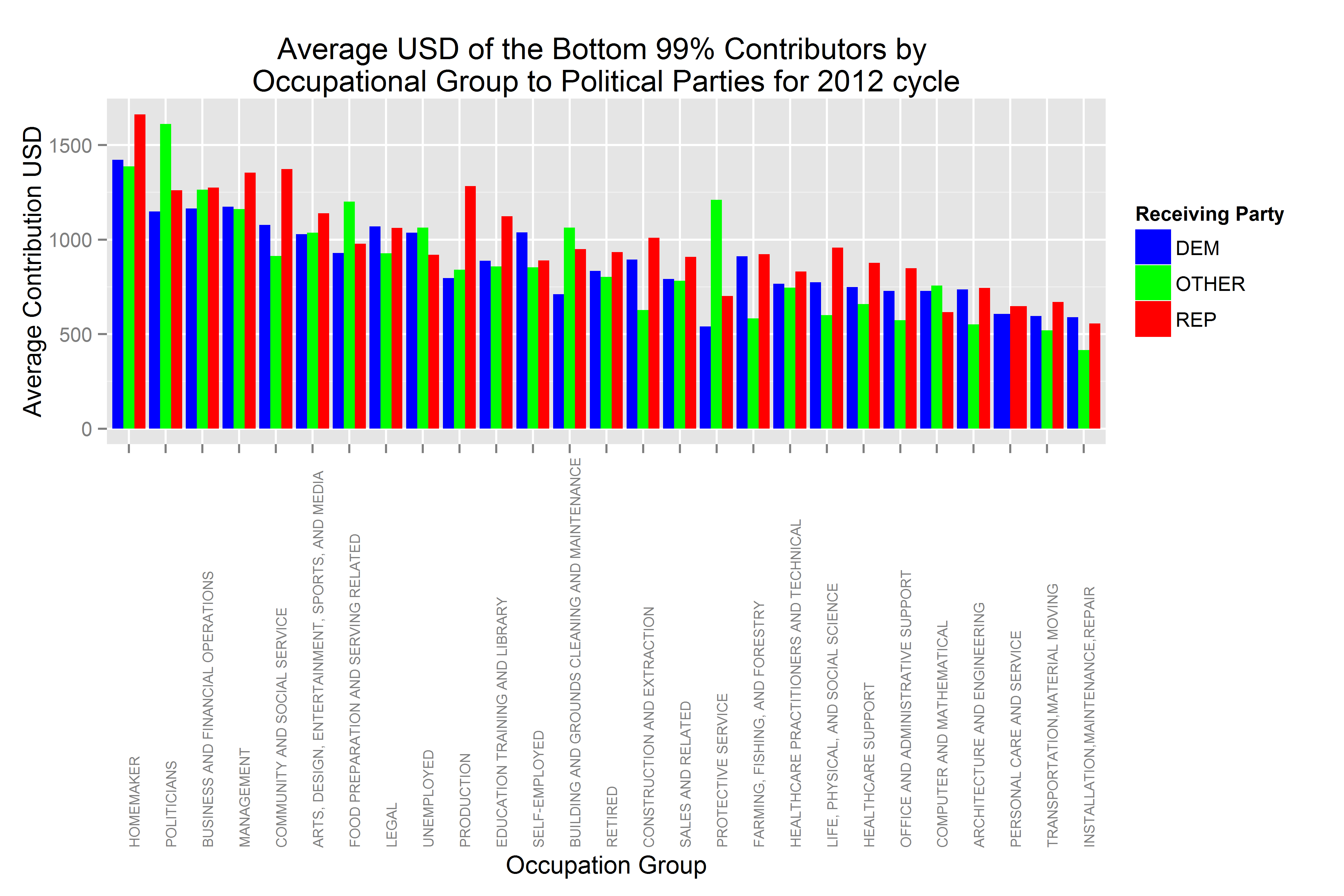 Another observation we could draw from the average contribution from the 99% plot is that “Other” non-Democrats/Republicans Parties depending heavily on the 99% as source of funding for their political campaigns. Third party candidates appear to be drawing most of their support from the little guy.