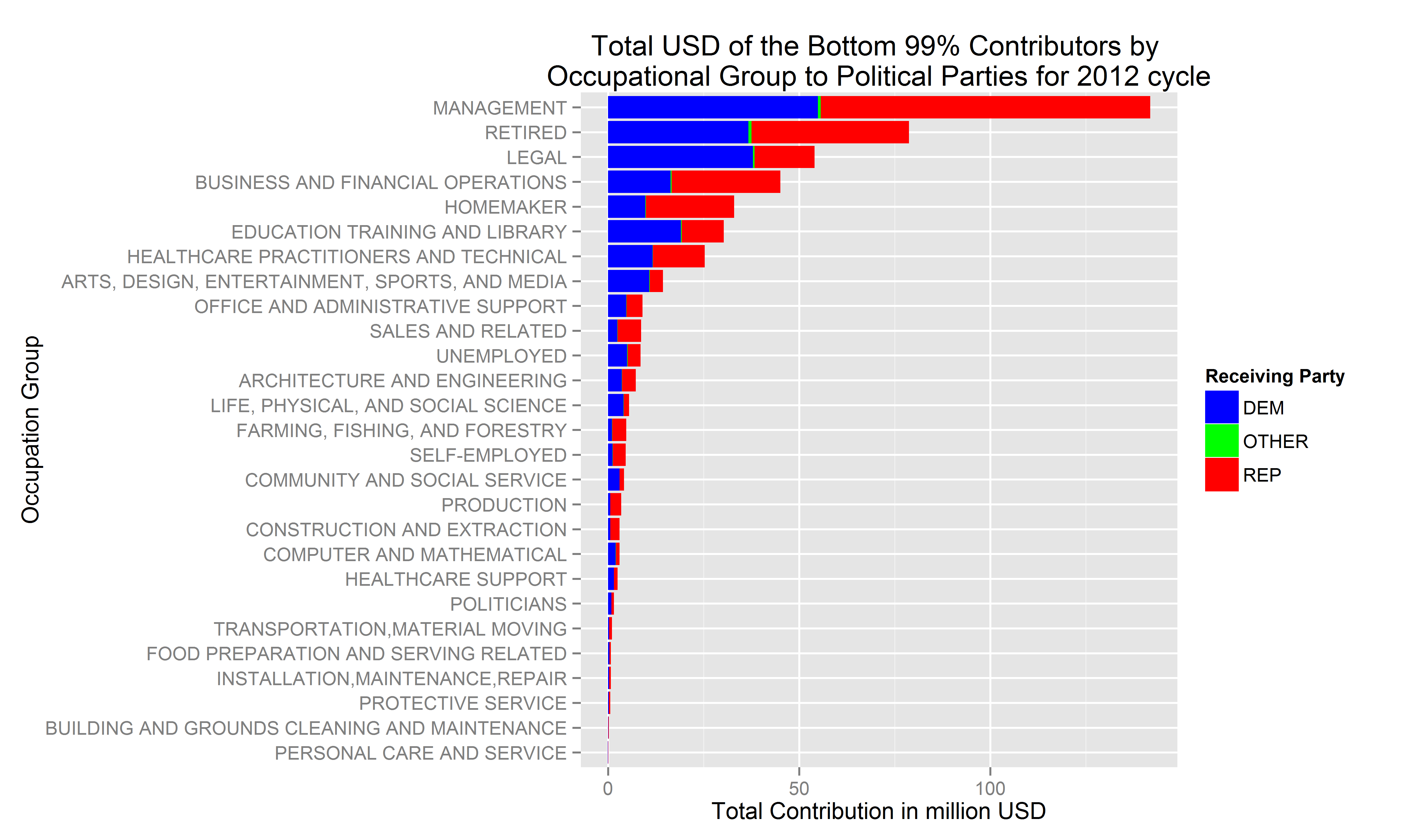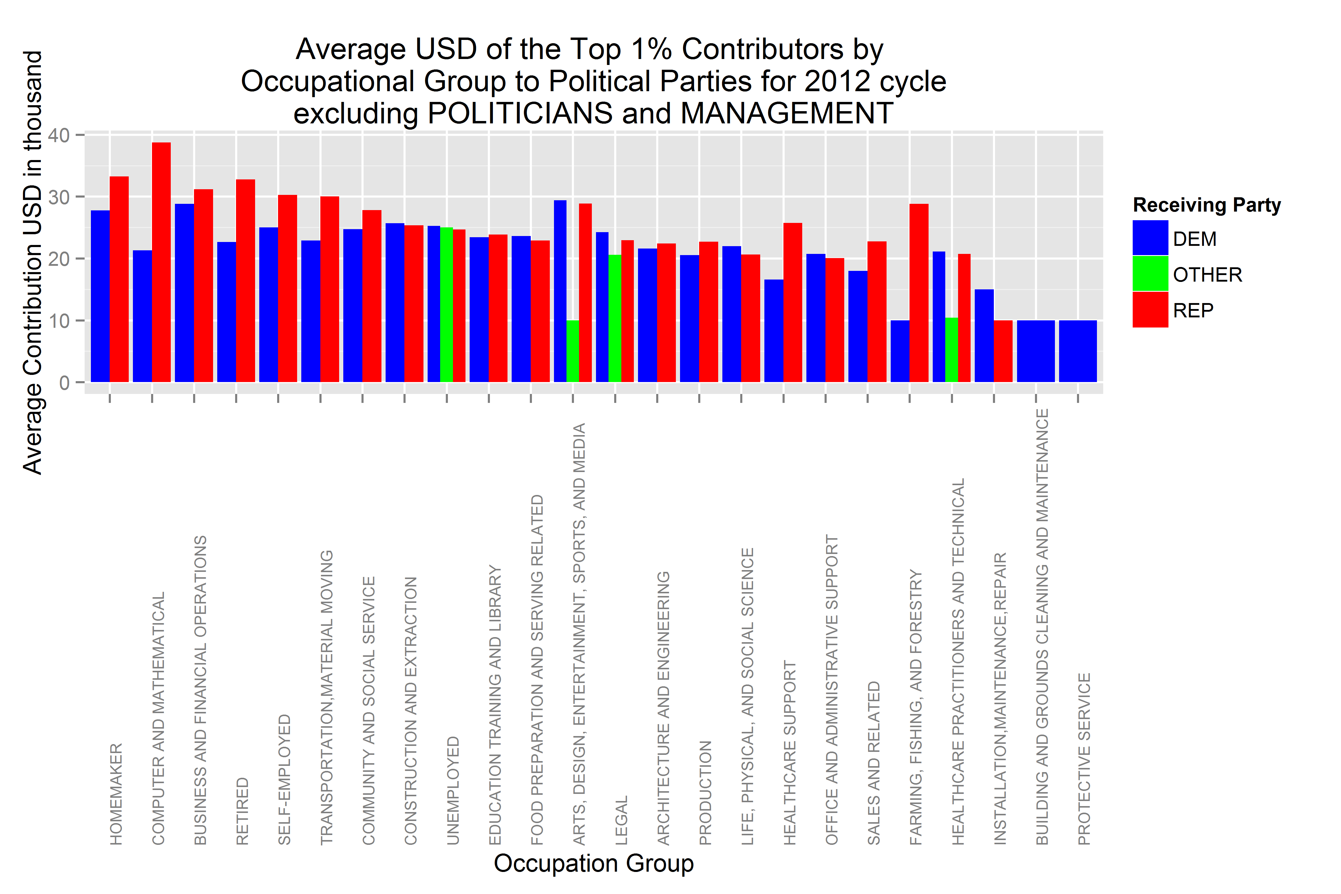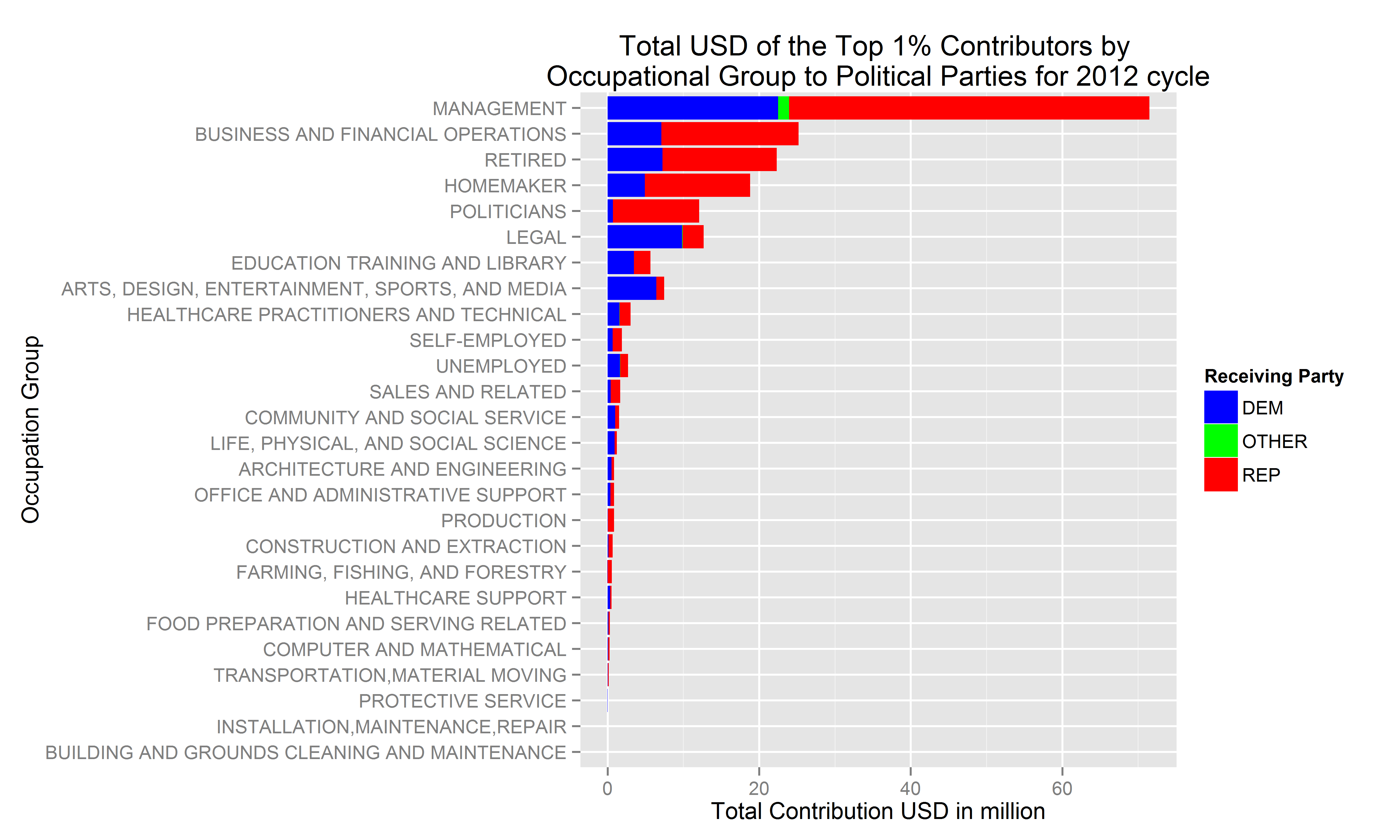 In the 2012 election cycle, which includes congressional and primary elections, the total amount of individual donations collected was USD 784 million. USD 220 million came from the top 1% donors, which made up of 28% of the total contribution. These elites wealthy donors were 7119 individuals, each had donated at least USD 10,000 to federal committees. So, who are the top 1%? What do they do for living that gave them such financial power to support political committees? The unique occupation titles from the dataset are simply overwhelming and difficult to construct appropriate analysis. Thus, these occupations were classified into 22 occupation groups according to the employment definition from Bureau of Statistics. Additional categories were created due to lack of definition to classify them into appropriate group. Among them are “Retired”, “Unemployed”, “Homemaker”, and “Politicians”.