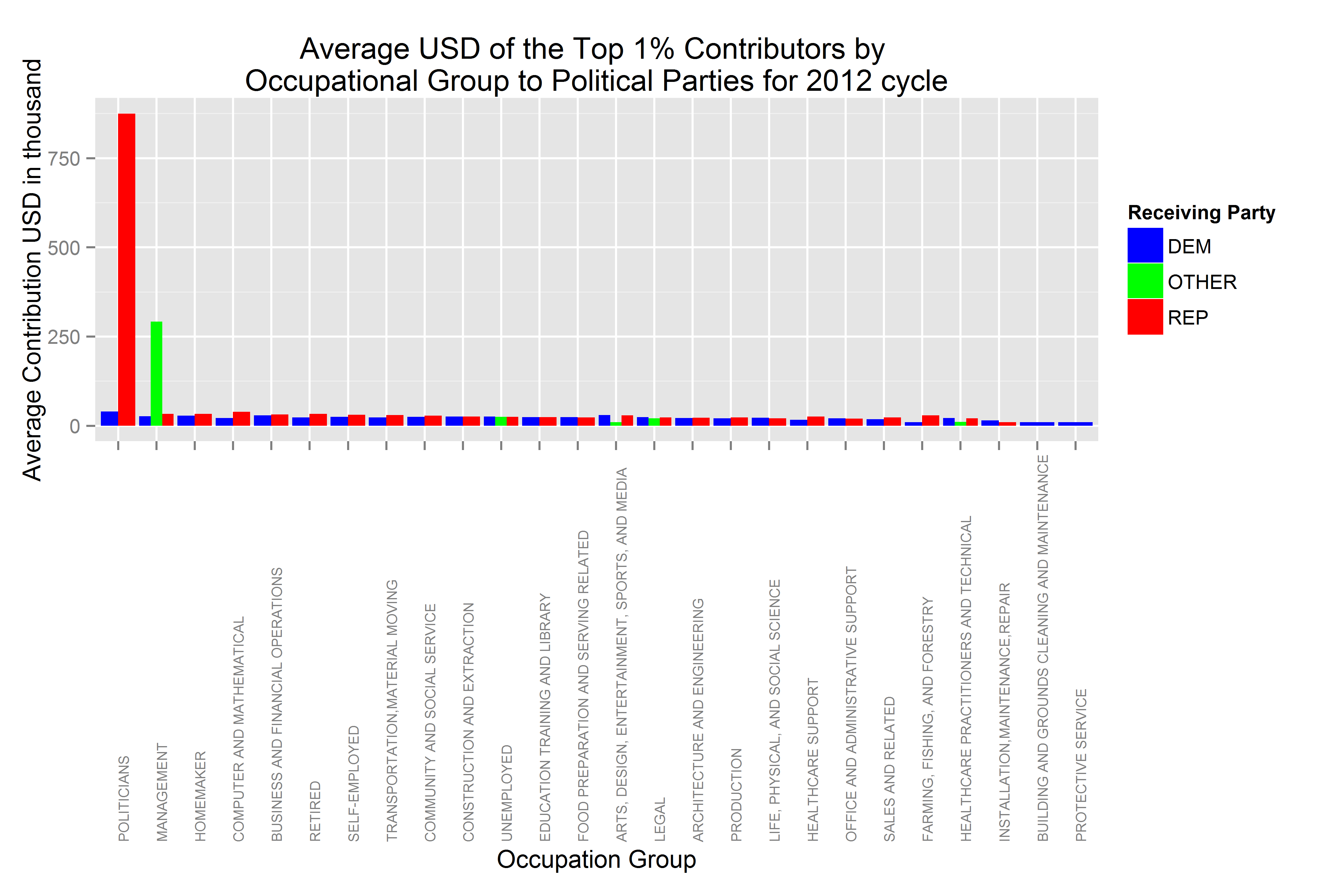 Perhaps we could look at the individual contribution by occupation group from another angle. When analyzing the average contribution by occupation group, “Politicians” group became top of the chart. Individuals belonging to this category are either currently holding public office or they had declared candidacy for office with no other occupation reported. Since there is no limit on how much candidates may contribute to their own committee, this group represents rich individuals funding their own campaigns.