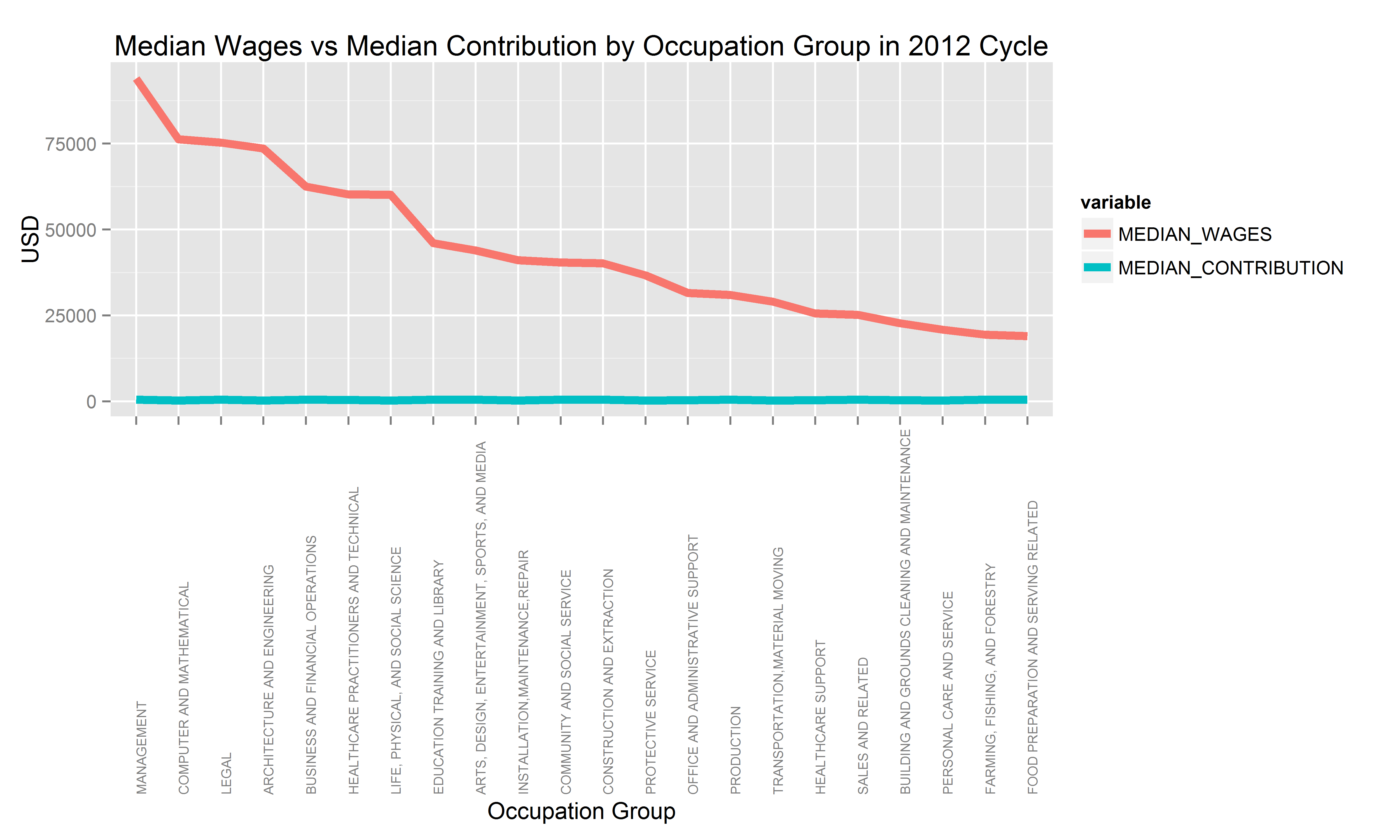 Another interesting question warranting further investigation is how the amount individual contributed to political committee proportionately consistent across occupation groups? When we plotted median wages per occupation group side by side with median political contribution, the median of donation per groups are rather constant while the median income varies significantly across groups. This implies that despite contributing the most overall, as a percentage of their income the wealthiest donors contributed the least.