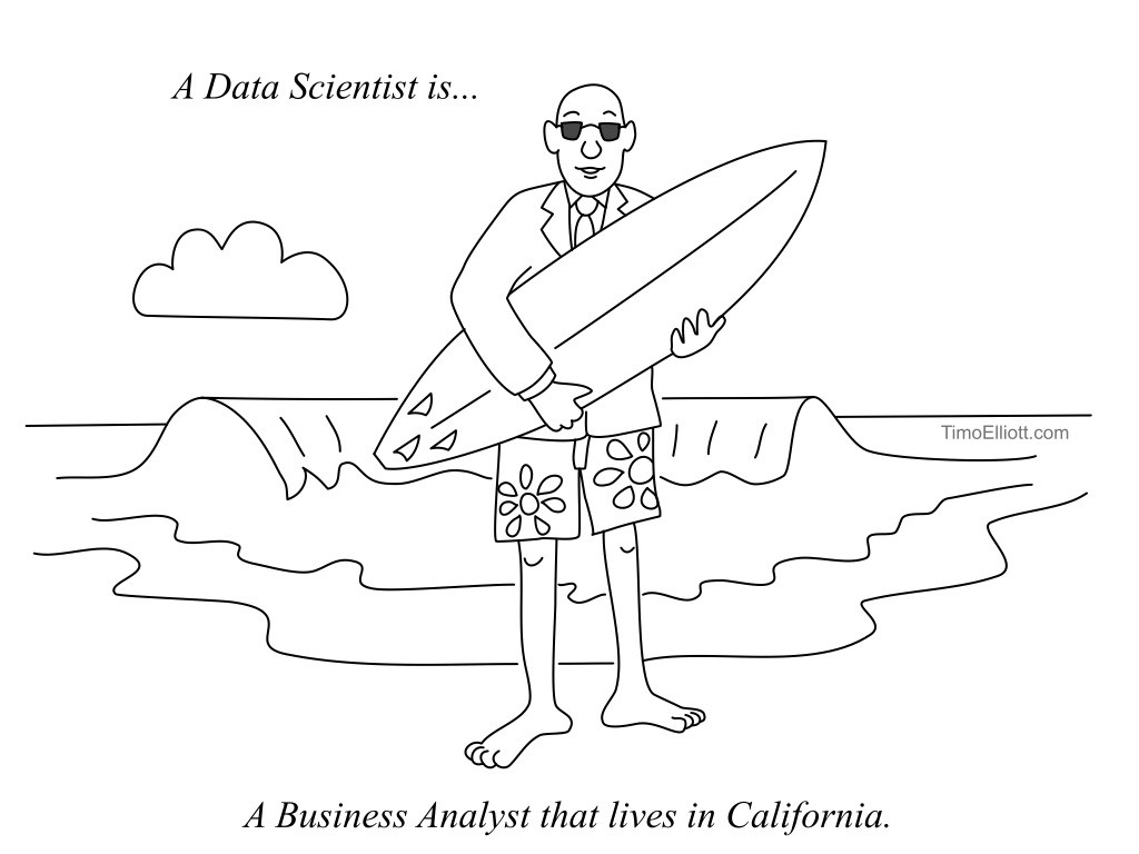 Truth be told, the industry does not have an agreed upon definition of a data scientist. Jokes such as “a data scientist is a data analyst living in the Silicon Valley” are abundant. Below is one such cartoon, just for fun.